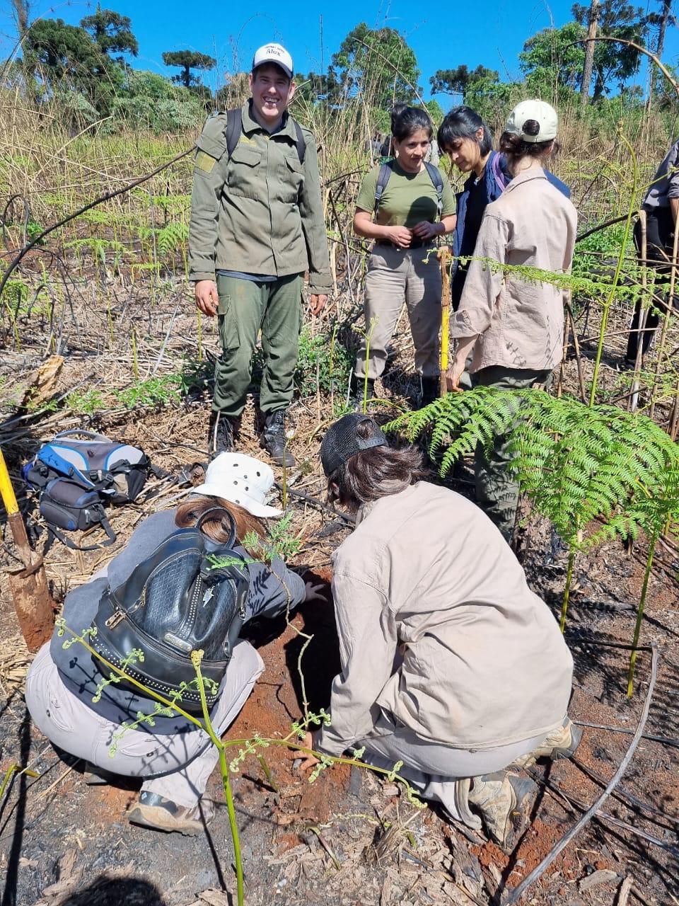 Guardaparques del Parque Provincial de la Araucaria y 23 estudiantes del segundo año de la carrera Técnico Universitario Guardaparque, que dicta la Facultad de Ciencias Forestales de la Universidad Nacional de Misiones, realizaron actividades de restauración del sector del área natural protegida de San Pedro afectado por el incendio registrado en agosto pasado. El grupo procedió a la plantación de ejemplares de araucaria, caña fístula, alecrín, laurel, lapacho, cereza y palo borracho. Los plantines utilizados habían sido producidos en el vivero de especies nativas del parque.